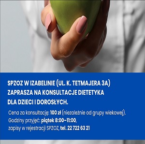 Zapraszamy na konsultacje dietetyka dla dzieci oraz osób dorosłych godziny przyjęć piątek 8-11 informacje o konsultacjach oraz zapisy realizowane są przez rejestrację tel. 22 722 63 21 Zobacz ulotkę